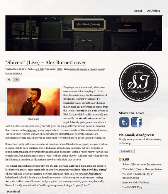 “People get very emotionally defensive over some artist attempting to cover their favourite song, but the rendition of Rowland S. Howard’s “Shivers” by Sparkadia’s Alex Burnett overwhelmes the original. His performance comes from the Triple J ‘Straight To You’ tribute to Nick Cave, (which I luckily attended) and was easily the stand-out cover of the night.”