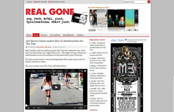 Music blog, Real Gone Rocks was awesome enough to feature the rad new video clip for The Trip’s “Find A Way.” This new clip was directed by Ash Baron Cohen, Sascha Baron Cohen’s cousin. Small world. Check out the clip and original post on Real Gone Rocks here.