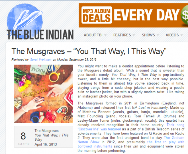 Music blog, The Blue Indian posted a really great review of The Musgraves’ debut album You That Way I This Way. The Blue Indian calls the album “pop-tastically sweet” and compare them to the sounds of the 1950s (poodle dresses and all). They gave the album a very solid 8/10 and we can’t be any happier about that! Read the full review below and check out the original article here.
