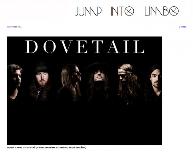 Music blog, Jump Into Limbo posted up a really great track-by-track review of Dovetail’s debut release Mount Karma. Jump Into Limbo had a lot of nice things to say about the album and remarked the band’s album as being a masterpiece and compares the band’s versatility to the likes of The Beatles and The Byrds. The writer also claims to have had the award winning track “Julie” on repeat for days and we are not surprised by this! You could check out the full feature over at Jump Into Limbo here.